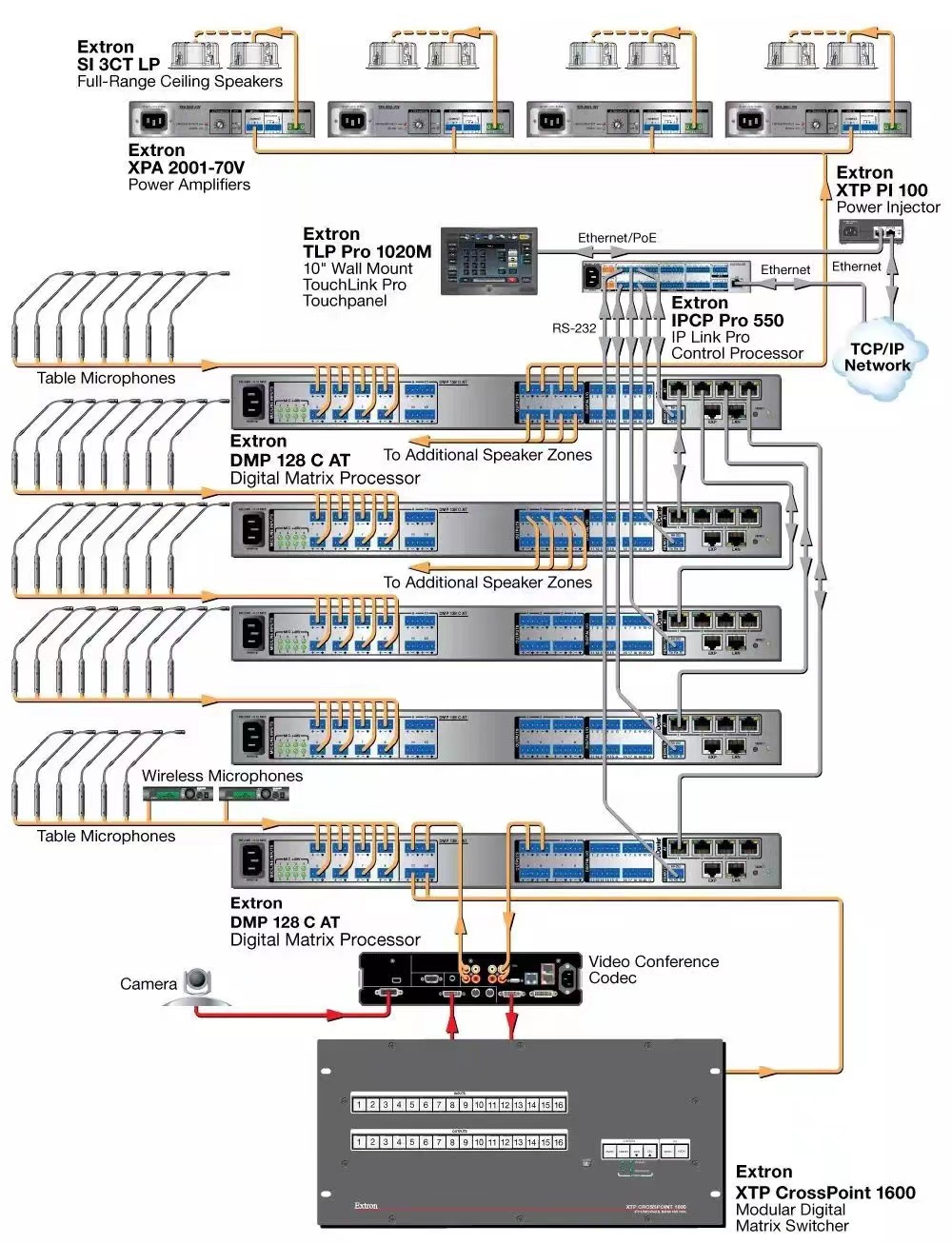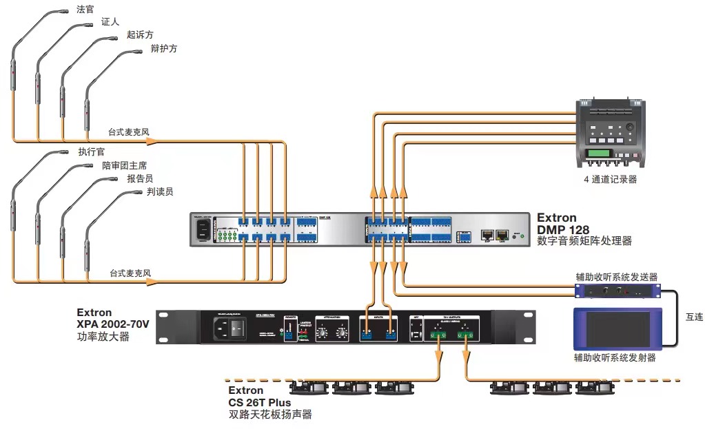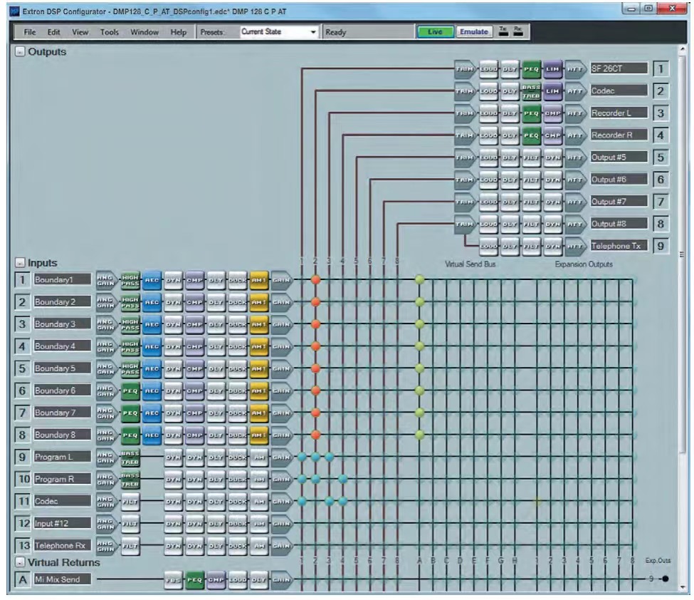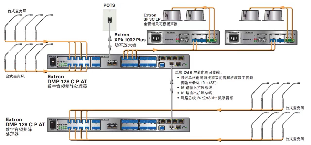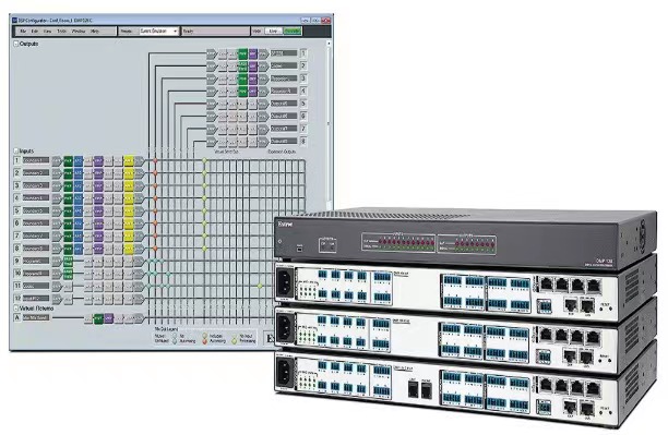 Extron DMP 128 系列提供了 DSP 的配置方式,可简化混音、路由、会议并达到室内声学的优化。通过使用 DSP 配置器 (DSP Configurator™) 软件可进行快速而直观的配置,使 DMP 128 能够在很短的时间内完成安装,并可进行实时可闻且易学的调整。数字音频扩展端口用于链接两台 DMP 128 设备,从而扩展了输入和输出信号管理以及路由的能力。在演示和会议应用环境中,如会议室、法庭和会议中心,DMP 128 无疑是理想之选。
