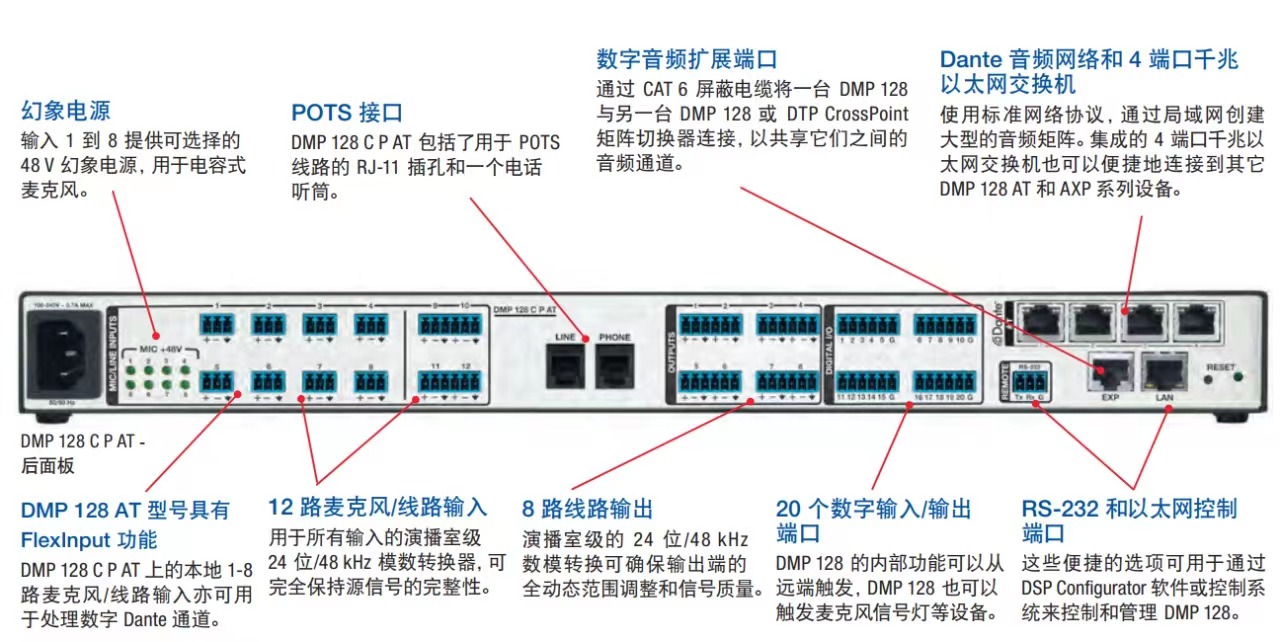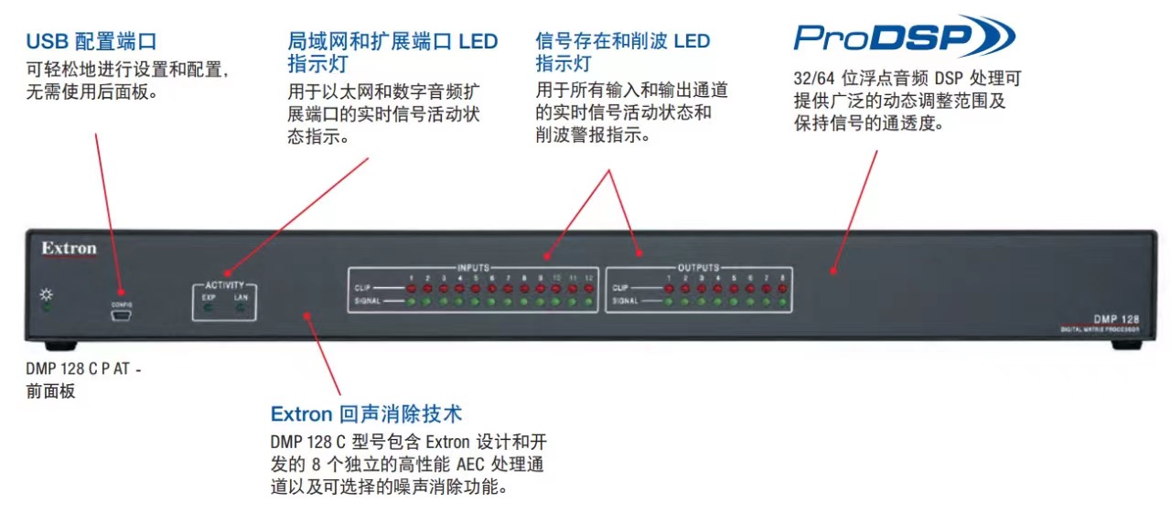 Extron DMP 128 数字音频矩阵处理器是一款 12X8 音频混音器,具有 Extron PRODSP™、自动混音、可选的 AEC(回声消除)加 DANTE® 音频网络功能、可选择处理 DANTE 通道或麦克风/线路输入的 FLEXINPUT 以及 POTS 模拟电话接口。